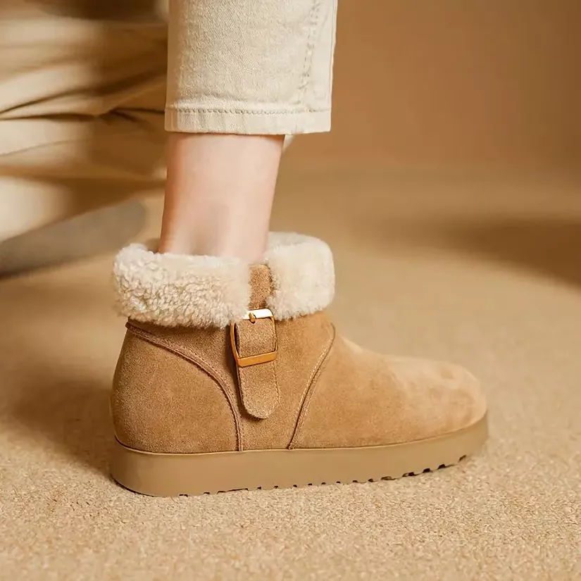 Women’s Winter Suede Snow Boots with Wool Fleece & Buckle Platform