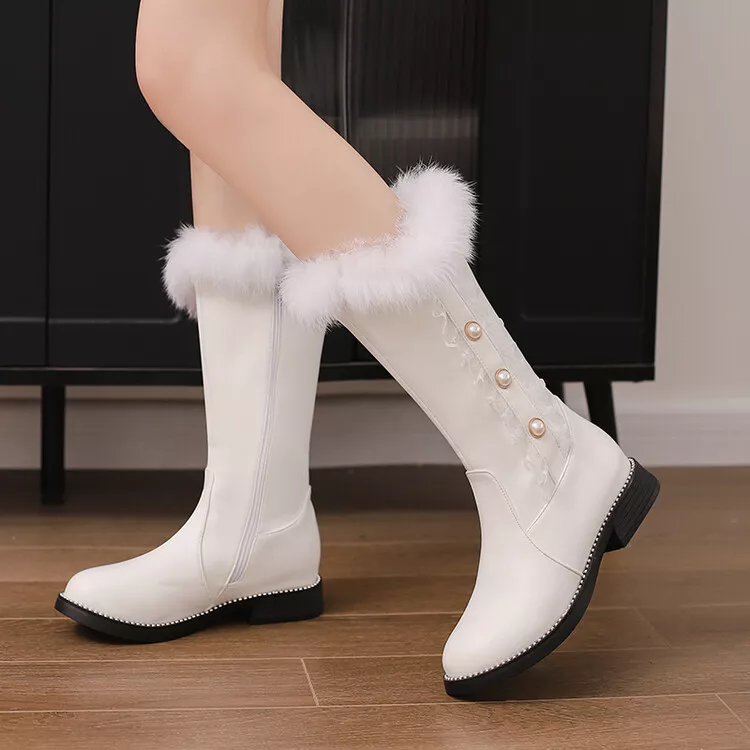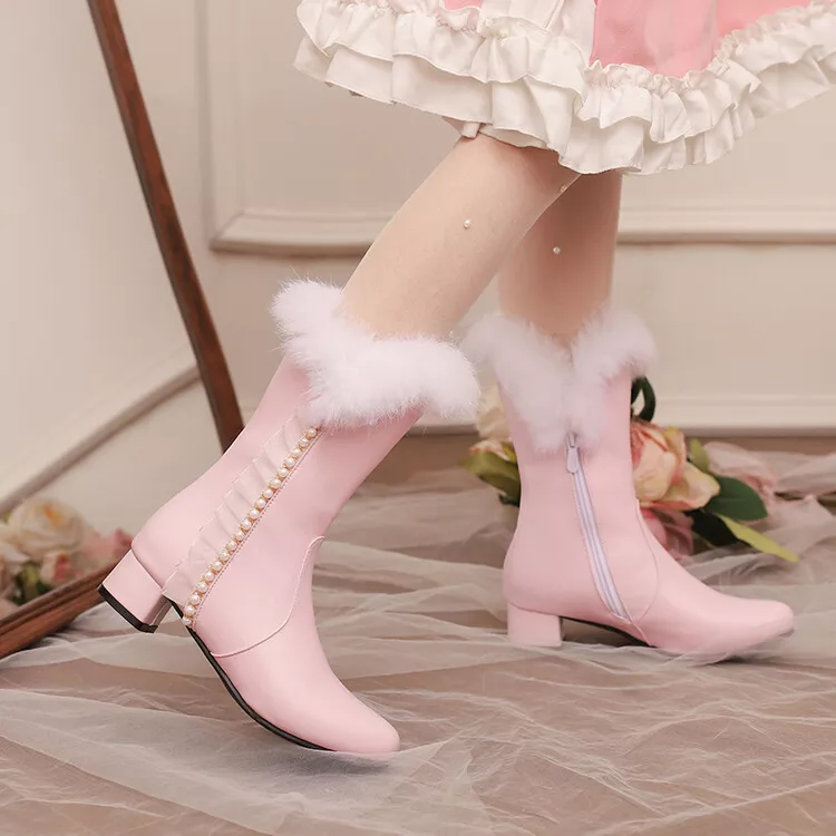 White Lace Pearl Lolita Mid-Calf Boots with Faux Fur & Low Heel