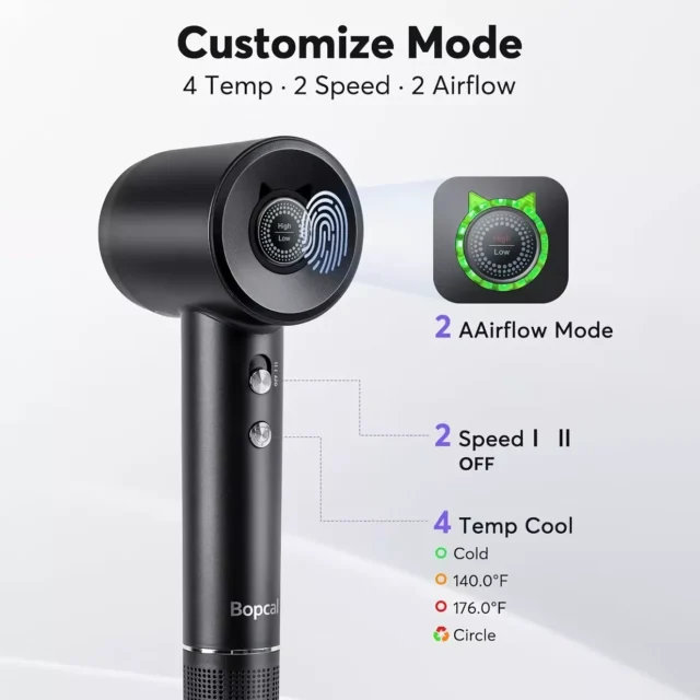 Weighing less than 1 lb, this hair dryer is both lightweight and portable, making it perfect for home styling or travel. Its sleek design, ergonomic grip, and intuitive controls ensure effortless handling. With 16 adjustable modes (4 temperatures × 4 speeds), you can fully customize your drying experience for every hair type and style preference.