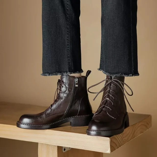 The boots feature a concise and sleek silhouette, enhanced with a subtle retro platform sole that adds height without sacrificing comfort. A cross-tied fashion element brings a unique, handcrafted touch to the design, making each step a statement.