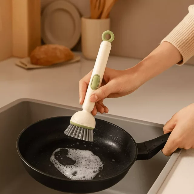 Say goodbye to stubborn grease and messy sponges with our Rotating Dish Brush with Long Handle & Liquid Storage. Designed for efficiency and comfort, this kitchen essential makes scrubbing pots, pans, and dishes a breeze. With a smart built-in soap dispenser and a long ergonomic handle, you’ll clean more with less effort — and without getting your hands dirty. Available in elegant green or clean white, it adds a modern touch to any kitchen.
