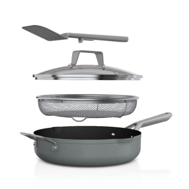 Introducing the revolutionary Sea Salt Grey NeverStick PossiblePan, a culinary game-changer. This 4-quart marvel isn’t just a pan; it’s a one-stop solution for all your cooking needs, ingeniously replacing 12 kitchen tools. Whether you’re sautéing, baking, or roasting, this PossiblePan is designed to handle it all with ease.