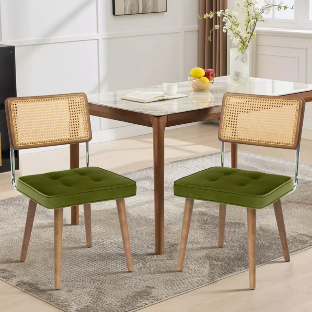 Perfect for daily meals, entertaining guests, or adding a stylish touch to your space, this set of four dining chairs blends durability, comfort, and elegance. The combination of rattan texture, velvet softness, and sturdy wood craftsmanship ensures these chairs don’t just look beautiful—they feel incredible too. Make your dining area the heart of your home with seating designed for comfort, style, and memorable moments.