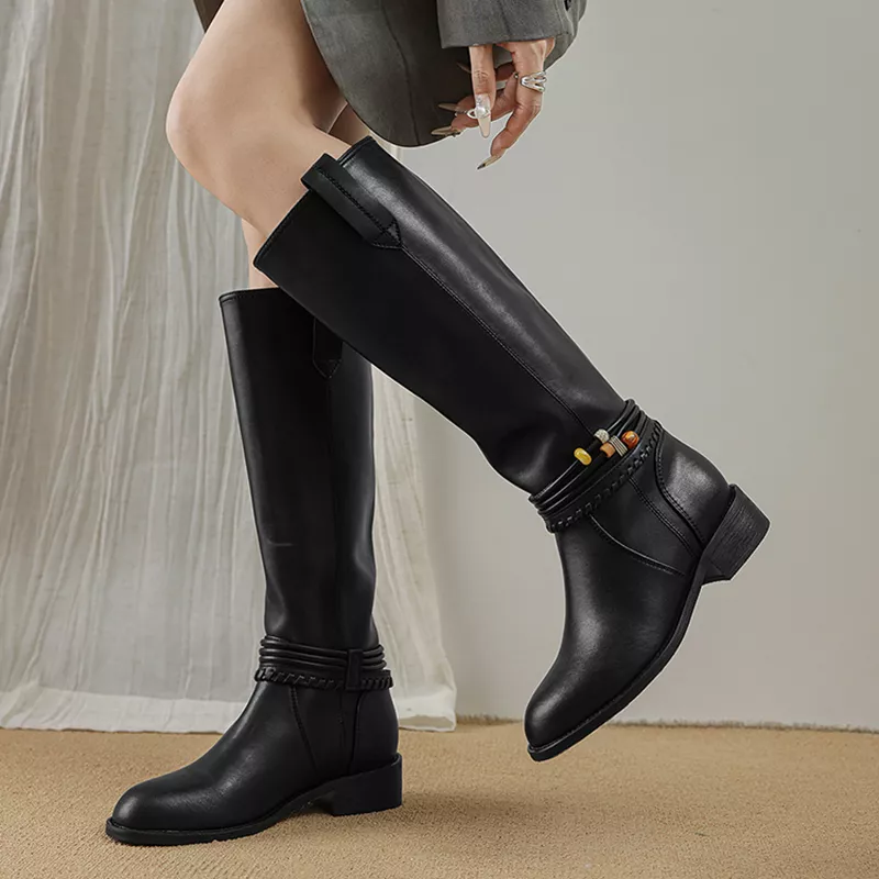 Genuine Leather Knee High Motorcycle Boots with Thick Heels for Women
