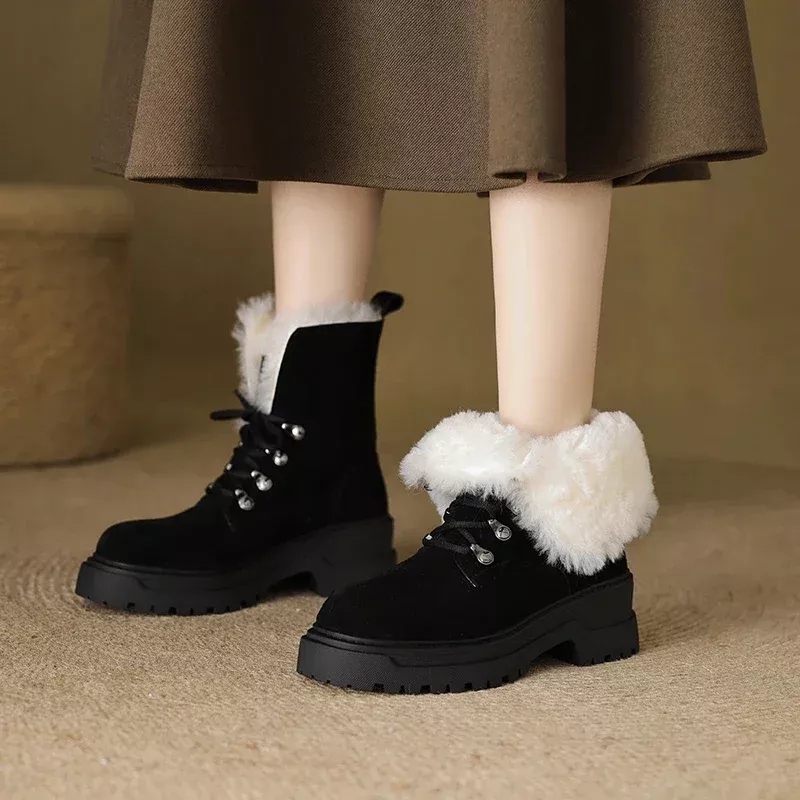 Women’s Suede Wool Snow Boots – Mid Heel Platform Ankle Boots for Winter