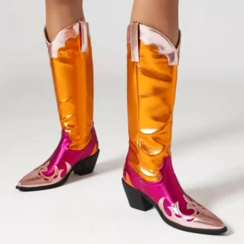 Women’s Western Cowboy Knee High Boots Gold Pink Patchwork Size 35-46