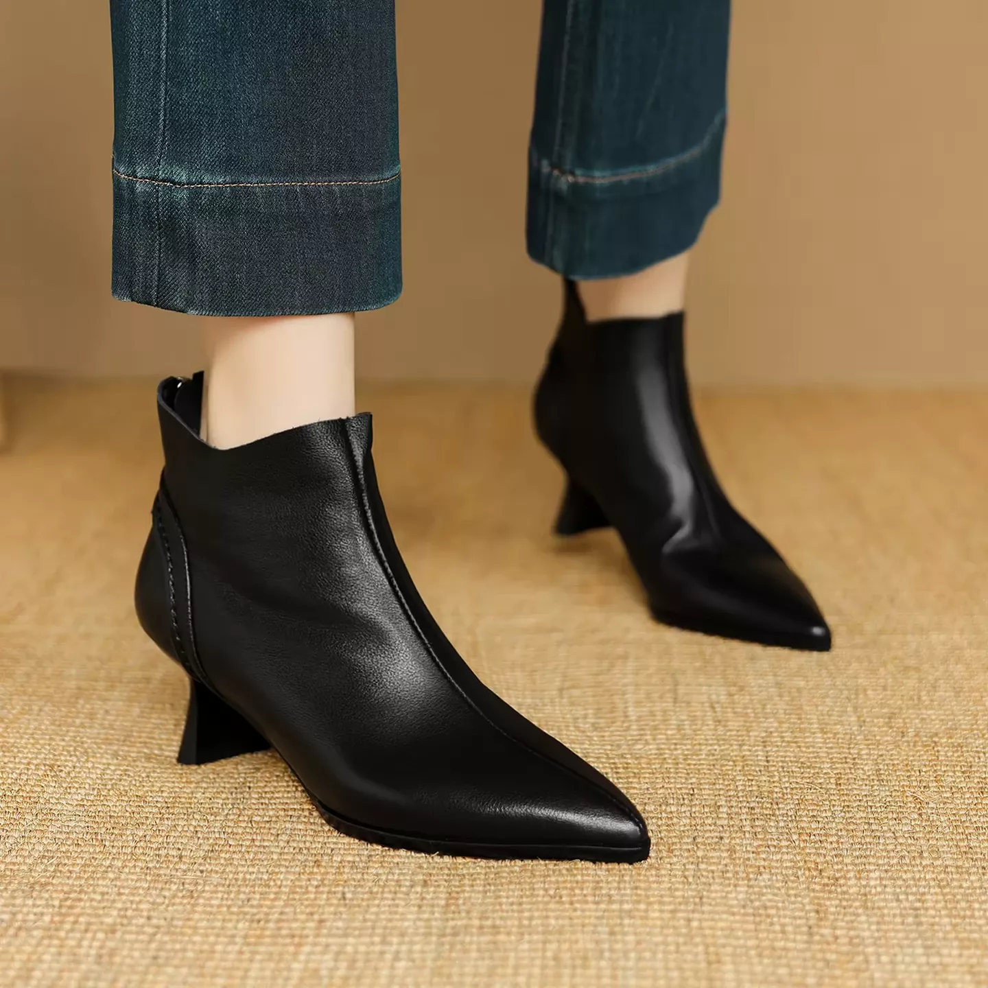 Winter Pointed-Toe Leather Ankle Boots with Sleek Kitten Heel