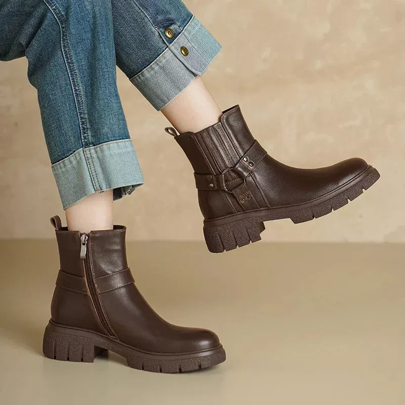 Women’s Retro Metal Buckle Mid-Calf Leather Boots with Chunky Sole