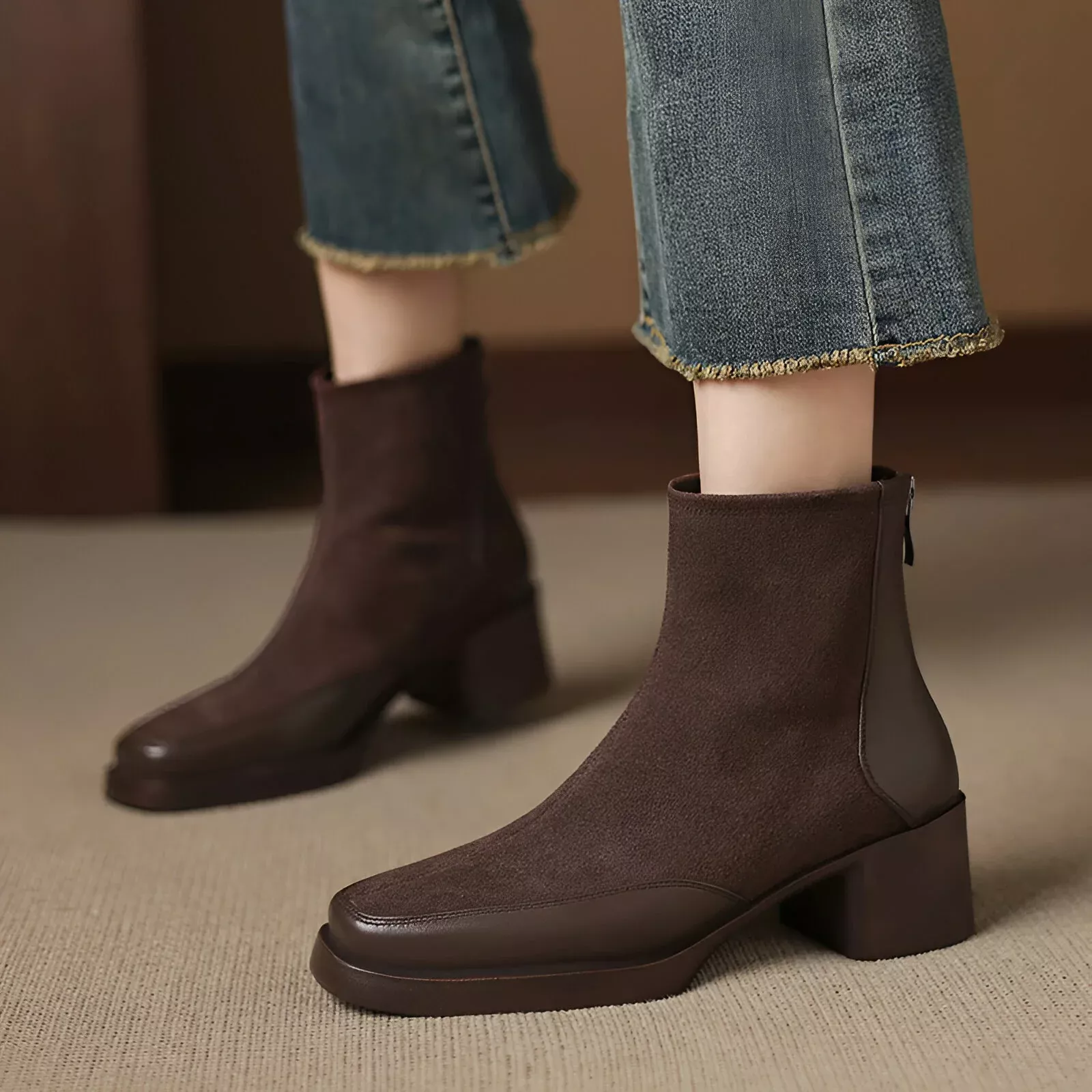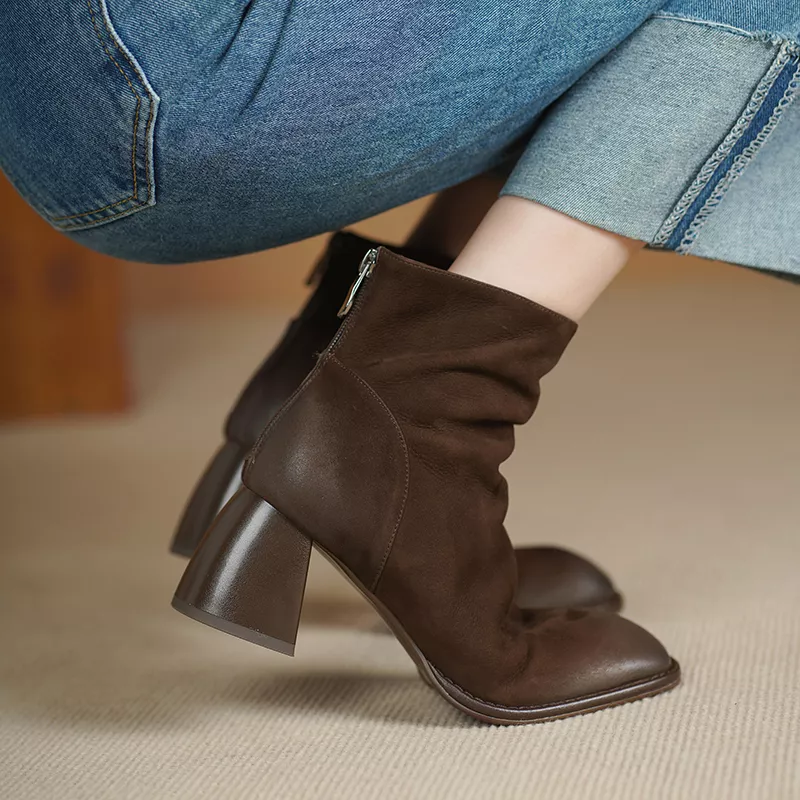 Retro Zip Ankle Boots for Women – High Heel Cow Suede Motorcycle Boots