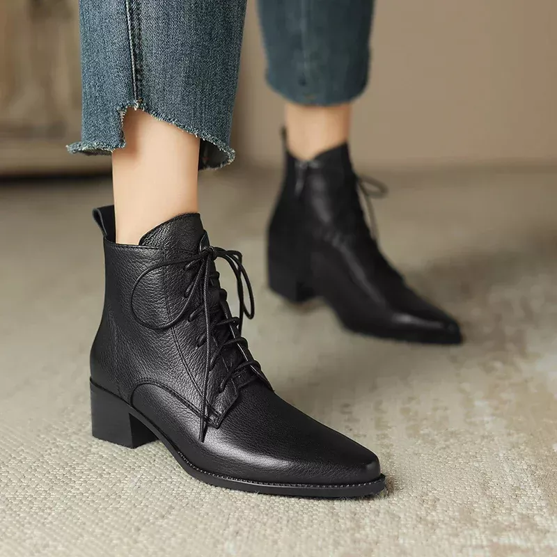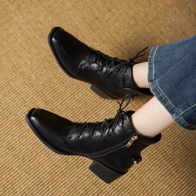 Women’s Genuine Leather Square Heel Ankle Boots – Elegant Round Toe High Heels for Winter
