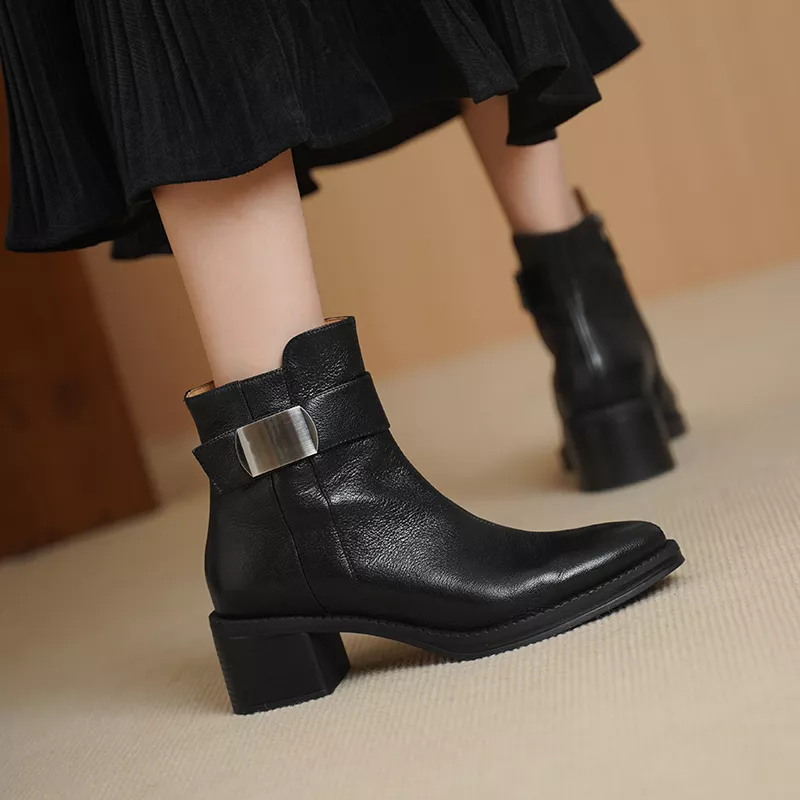 Women’s Genuine Leather Zip Ankle Boots with Thick High Heels