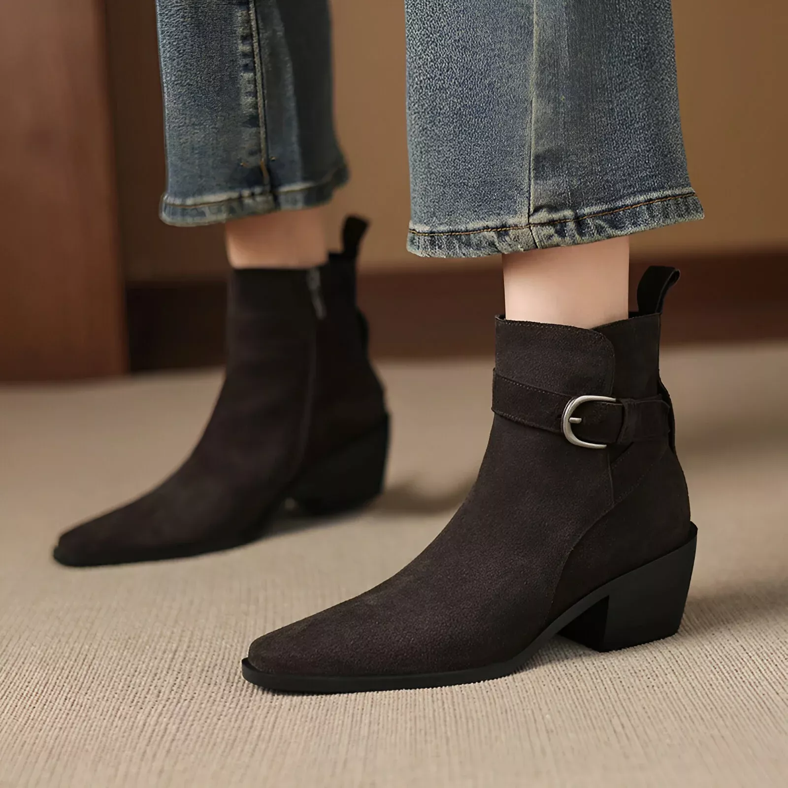 Winter Suede Ankle Boots for Women with Pointed Toe and Belt Buckle Design