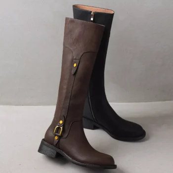 Genuine Leather Punk Knee-High Boots with Metal Buckle and Side Zip