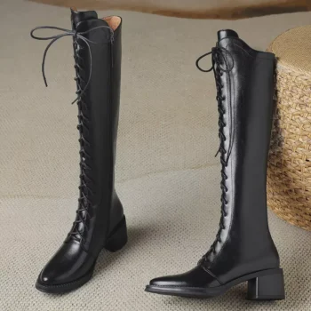 Women’s Genuine Leather Lace-Up Knee High Knight Boots – 5cm Heel, Side Zip