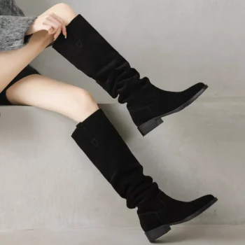 Women’s Suede Leather 6cm Heel Pointed Toe Slip-On Knee High Boots – Elegant Pleated Autumn Long Boots