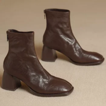 Elegant Leather Square Toe Ankle Boots for Women – 6.5cm Heel, Back Zip