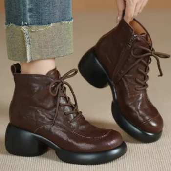 Cow Leather Lace-Up Side Zip Ankle Motorcycle Boots – Casual Fall Booties