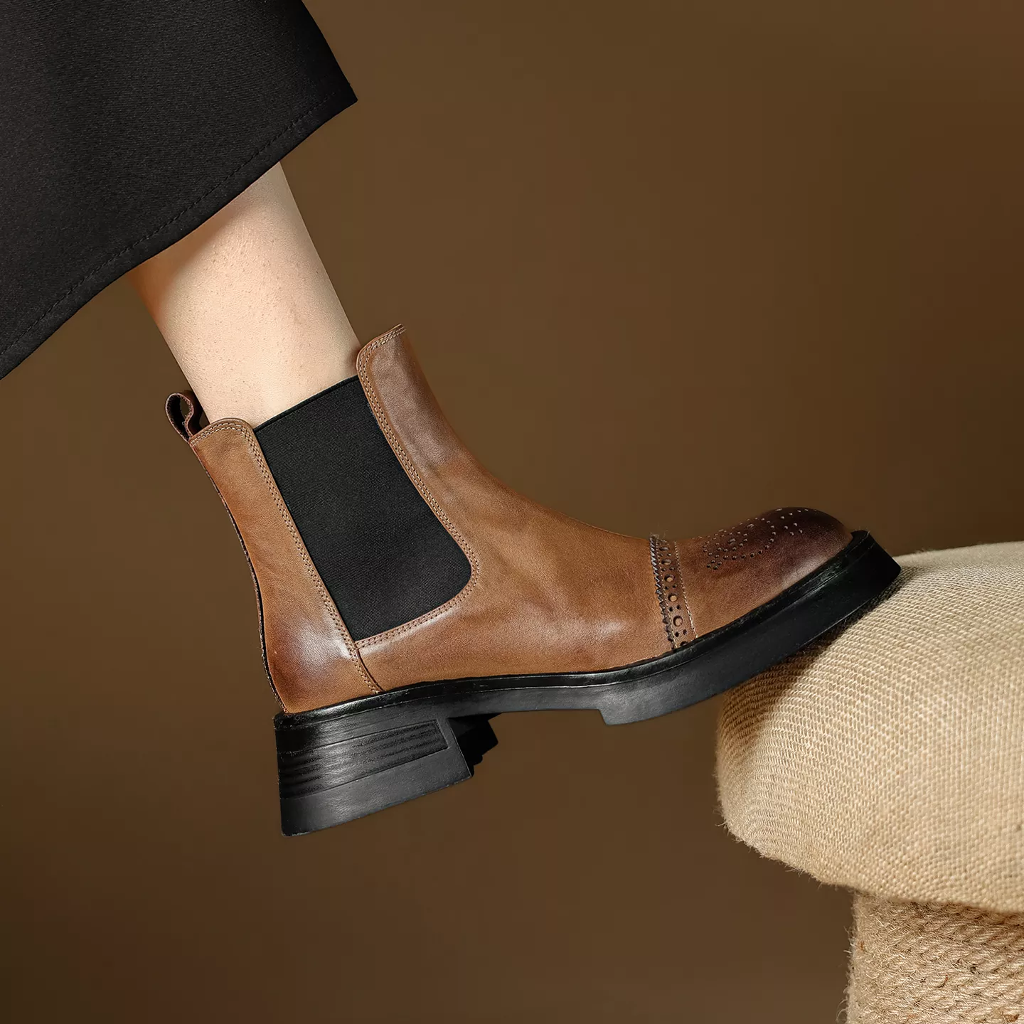 Women’s Buckle Chelsea Boots – Handmade Genuine Leather, Round Toe, Low Heel Ankle Boots