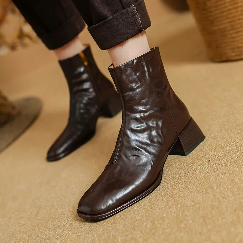 Handmade Genuine Leather Women’s Boots with Chunky Heel and Zipper Closure