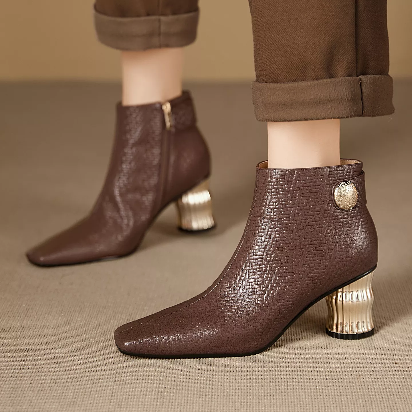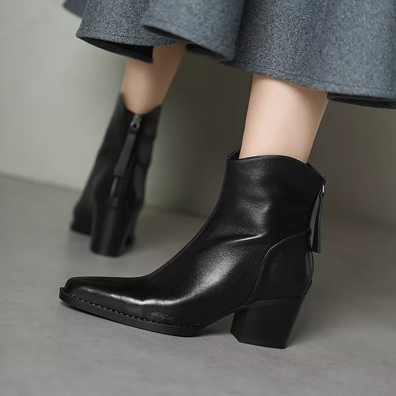 Women’s Genuine Leather Zip Ankle Boots with Thick High Heels