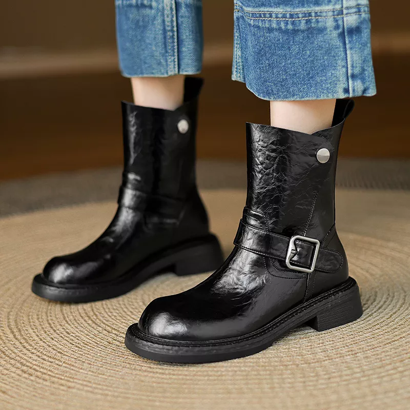 Women’s Mid-Calf Genuine Leather Motorcycle Boots with Square Heel