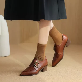 Spring Autumn Women’s Genuine Leather Loafers Pointed Toe Chunky Heel Pumps