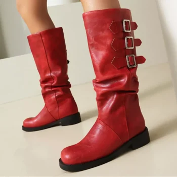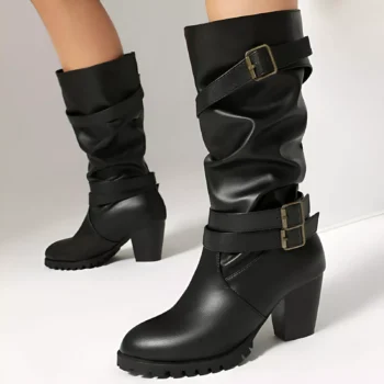Women’s Mid-Calf Pleated Western Boots – Buckle Detail, Low Heels, Plus Sizes