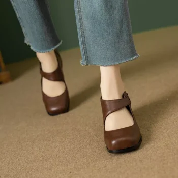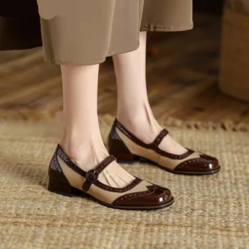 Women’s Retro Brogue Leather Pumps with Thick Heels