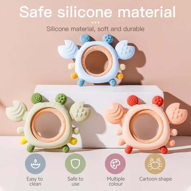 Say goodbye to fussy teething days with our adorable Silicone Crab Baby Teether. Designed with your baby’s comfort and safety in mind, this charming animal-shaped teether offers natural relief for sore gums while engaging your little one’s curiosity. Crafted from high-quality food-grade silicone and paired with a smooth wooden ring, it’s free from BPA, latex, PVC, phthalates, and nitrosamines – giving you peace of mind and your baby a safe chewing companion.