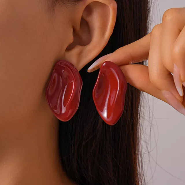 Crafted with care, these earrings feature an eye-catching red drop oil design that complements any outfit. The irregular oval shape and intricate leaf pattern make these earrings stand out, turning them from an accessory into a statement piece. The simplicity of the design balances perfectly with its bold red hue, creating a captivating contrast that’s both modern and timeless.