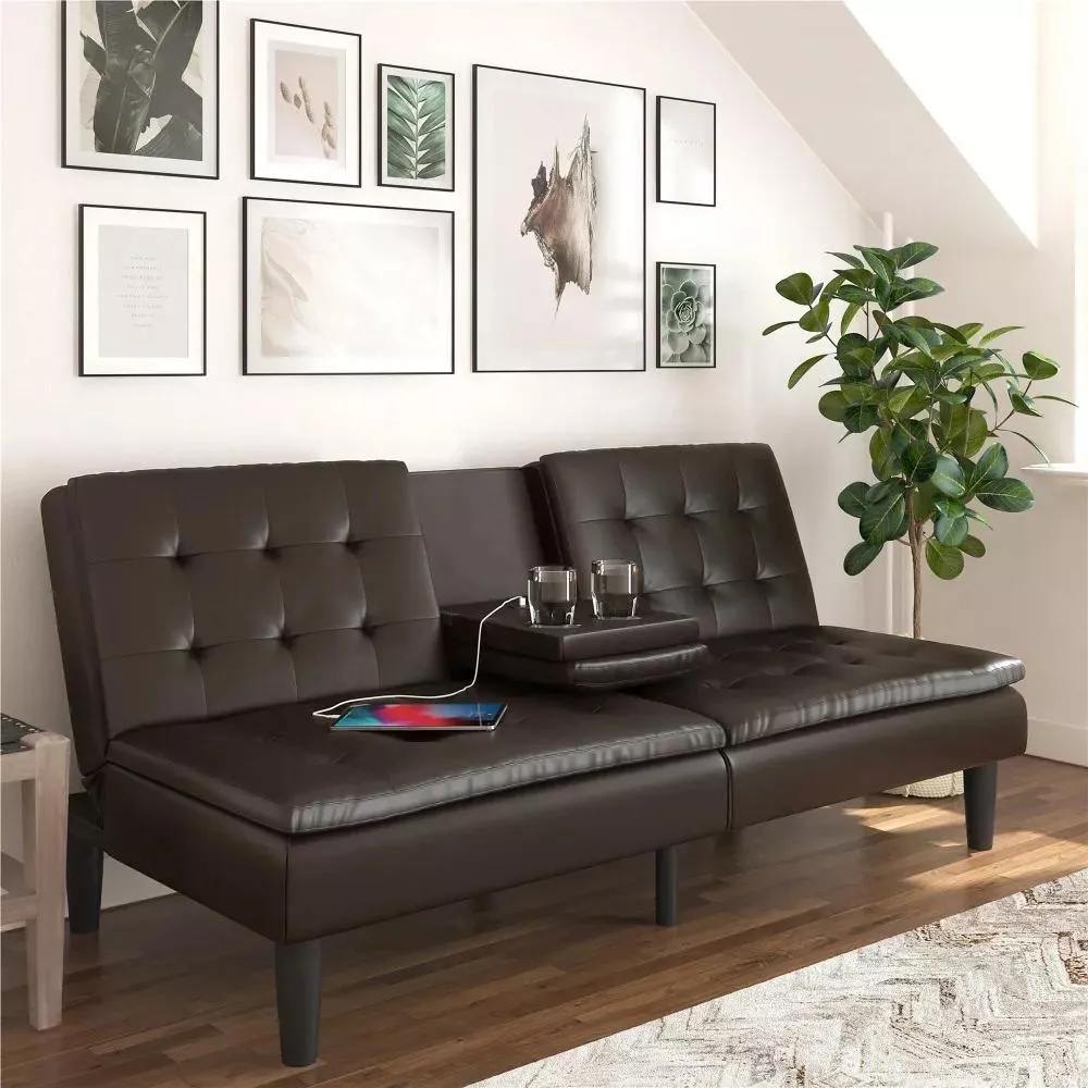 Modern Dark Brown Faux Leather Sofa with Cupholder & USB Charging