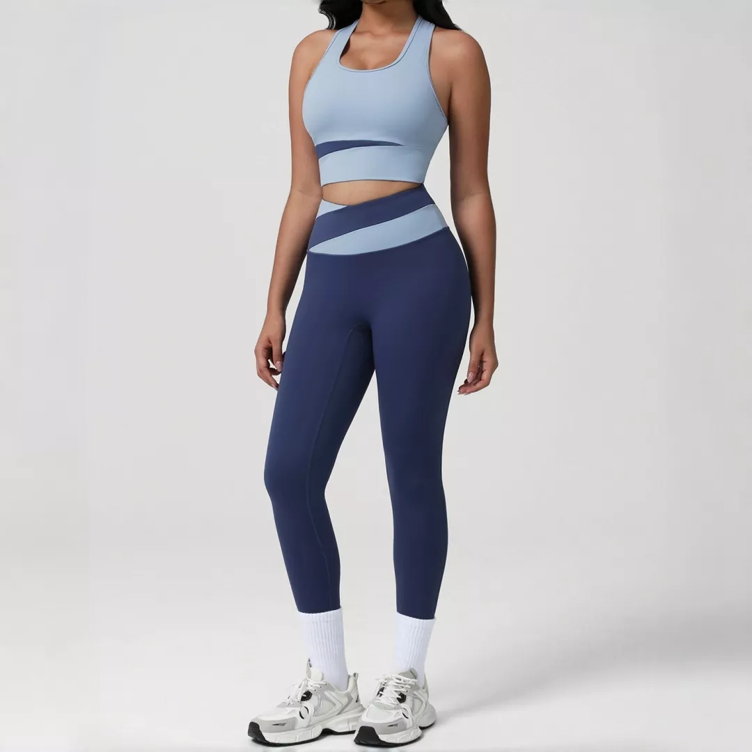 High Waist Color-Block Yoga Set with Sports Bra & Tights – Workout & Running Tracksuit