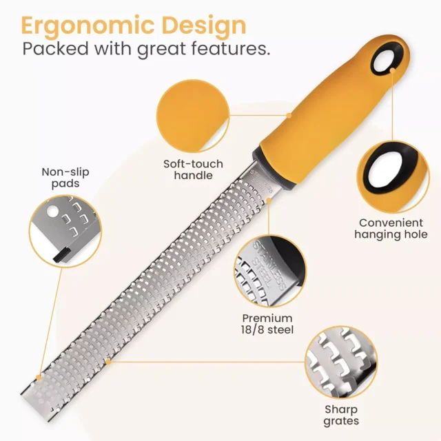 Bring flavor to life in your kitchen with this premium stainless steel zester and grater. Whether you’re adding a citrusy kick to desserts or a cheesy finish to pasta, this versatile tool is your go-to for fast, efficient, and safe food prep. Crafted for everyday use, it’s perfect for grating lemon zest, chocolate shavings, parmesan cheese, ginger, garlic, and more—delivering results that professional chefs would envy.
