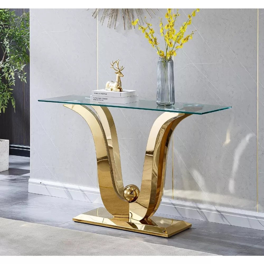 Modern Glass Console Table with Gold Stainless Steel Legs, 47″ Clear Top