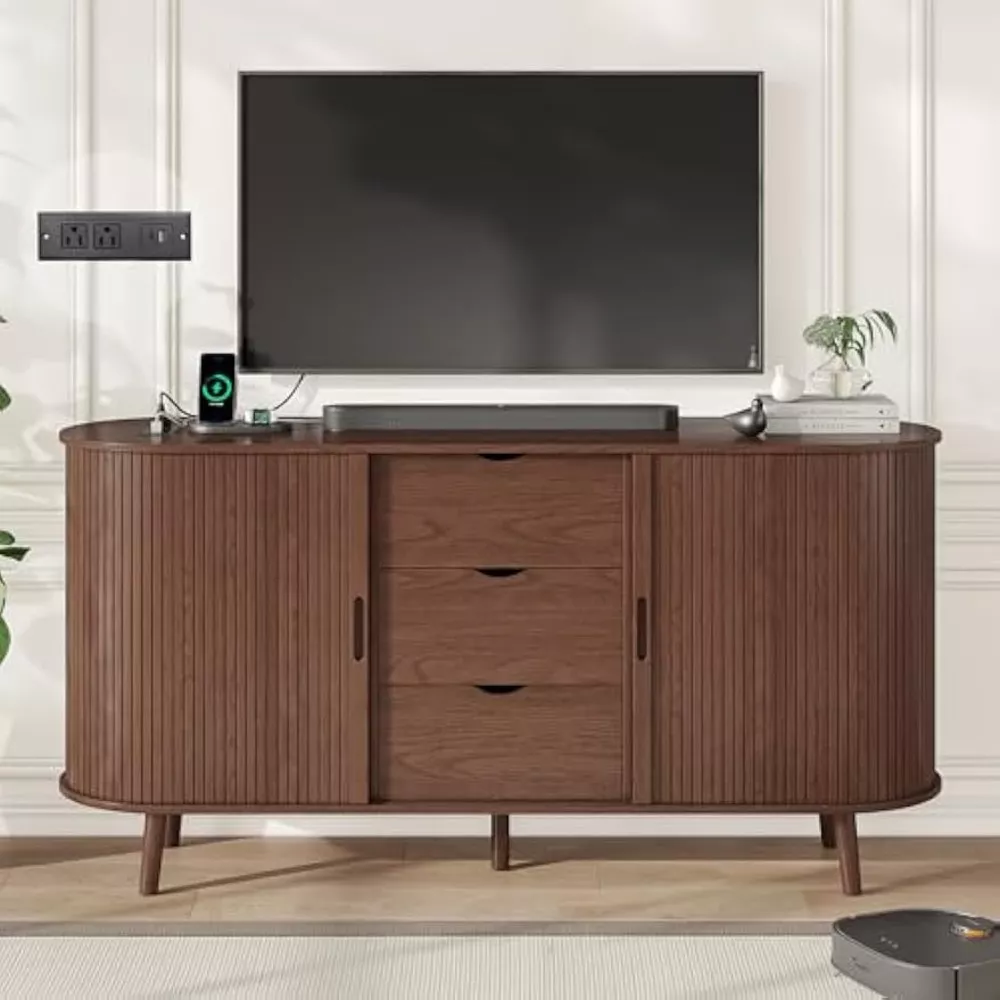 59″ Mid Century Modern TV Stand with Charging Station & Sliding Doors