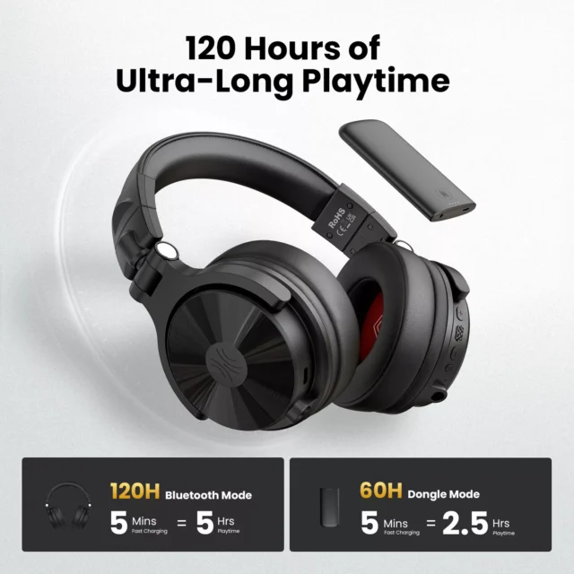 Equipped with a powerful 50mm dynamic driver and four connection modes, these headphones give you the freedom to connect your way. Choose between 3.5mm wired, 6.35mm DJ interface, low-latency dongle mode, or Bluetooth 5.3 for seamless audio across any platform. And with up to 120 hours of playtime in Bluetooth mode, or 60 hours in dongle mode, your sound lasts as long as your creativity does.
