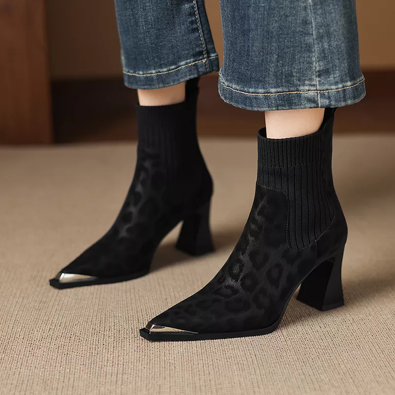 Leopard Print Genuine Leather Western High Heel Ankle Boots for Women