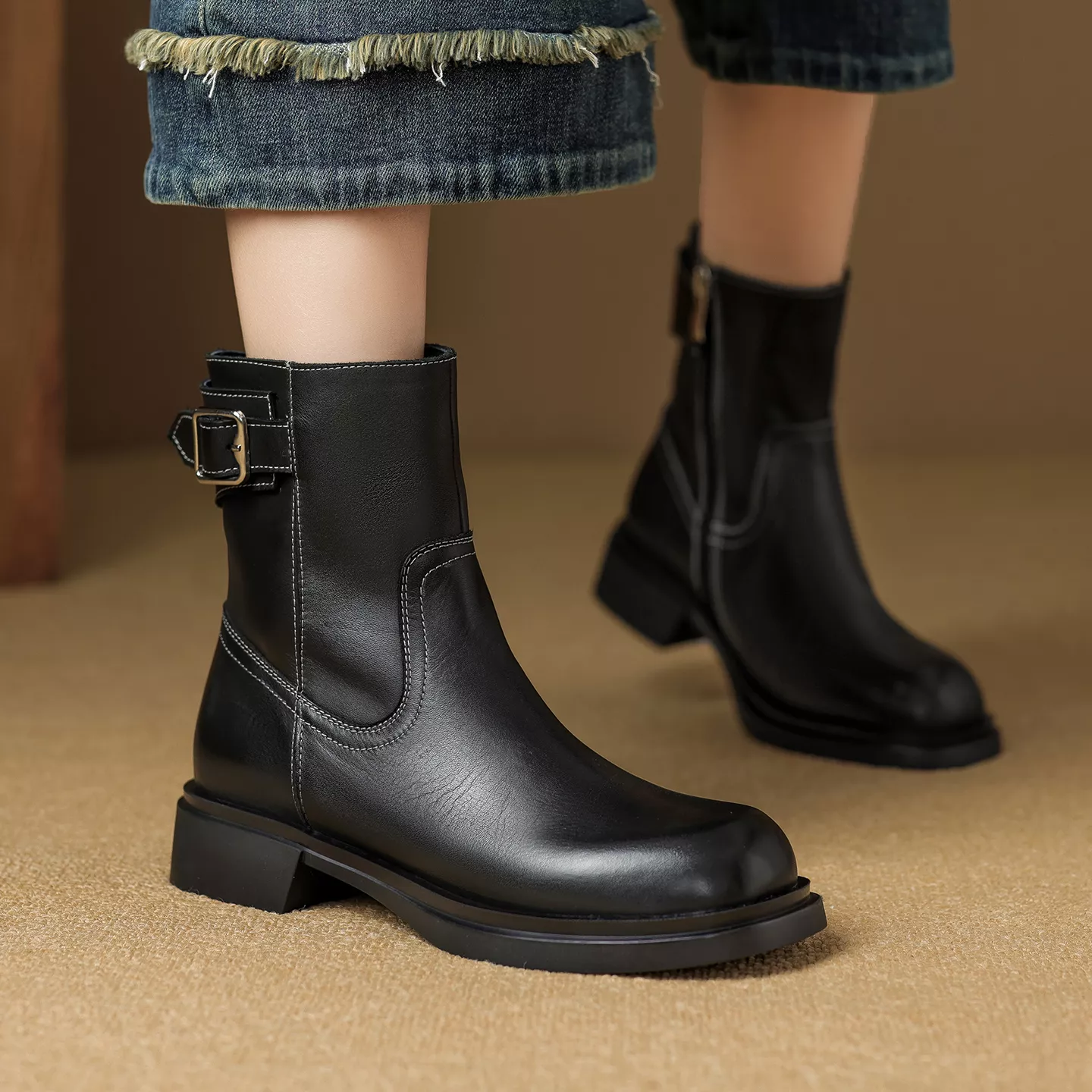 Genuine Leather Retro Ankle Boots for Women – Thick Heel Office Style