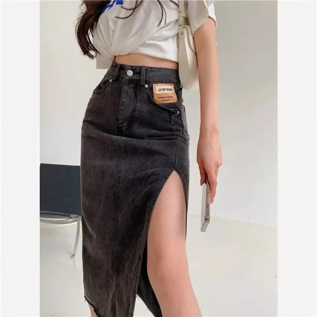 Summer Vintage Denim Maxi Skirt with Side Split – Casual Long Jean Skirt