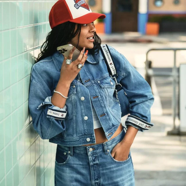 Crafted from a blend of 50% cotton and 50% organic cotton, the jacket offers both durability and breathability. Its rigid denim structure is designed to hold its shape, while the contrast wash on the lower half adds a unique touch that sets this piece apart from other denim jackets. The semi-spread collar and button closure give it a classic feel, while the standout details, like the iconic Tommy Girl repeat star logo under the cuff and the Tommy Girl frayed star patch on the back, make it unmistakably Tommy Hilfiger.