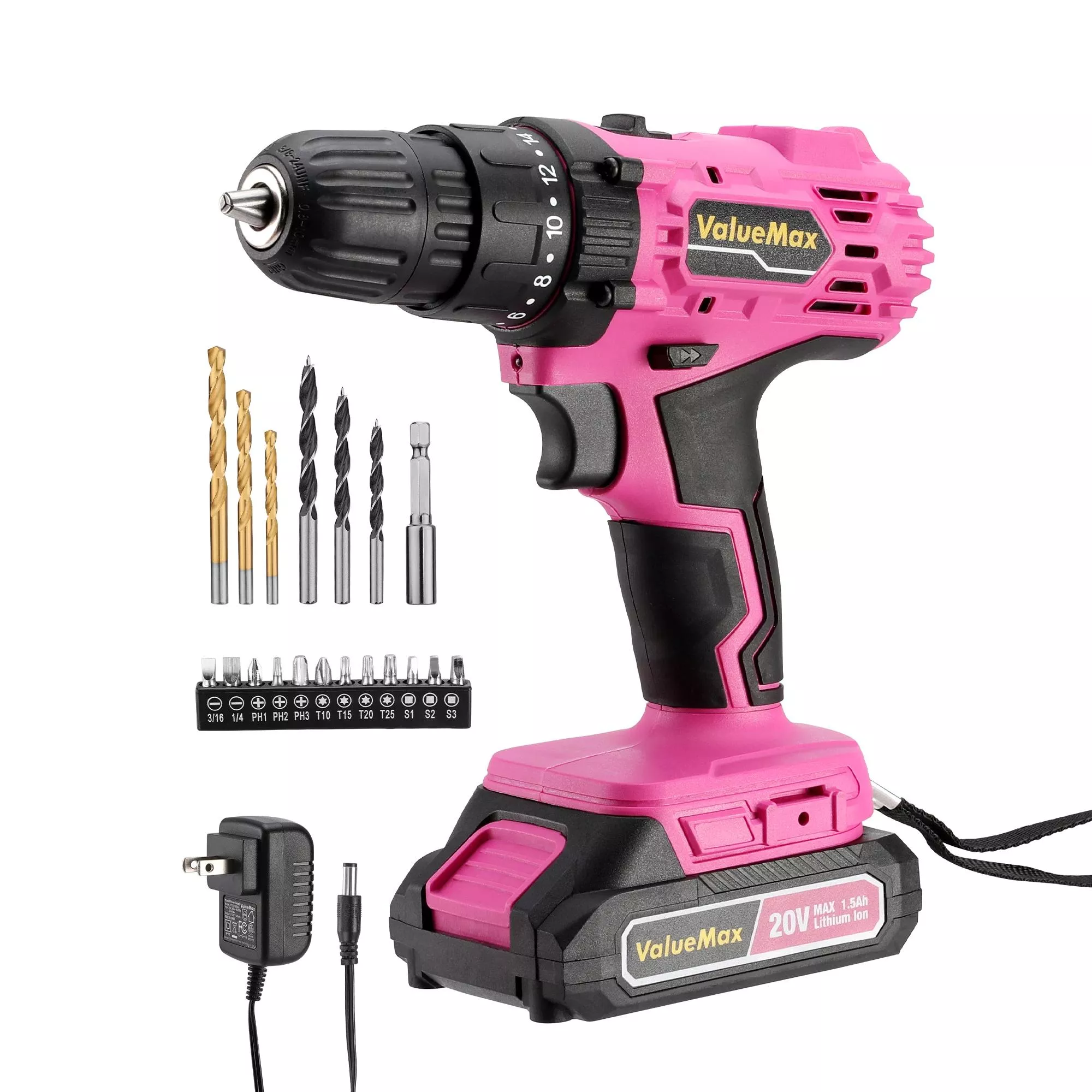 20V Pink Cordless Power Drill Set with LED Light & 18+1 Torque Settings