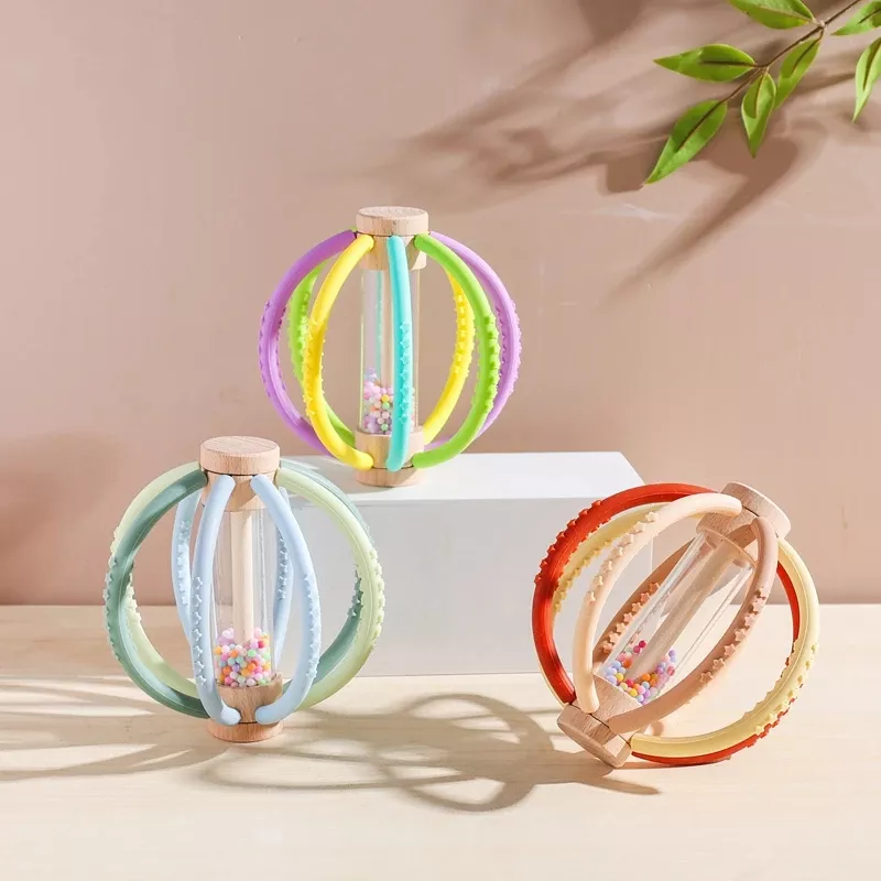 Baby Rattle Wooden Rain Drum Sensory Toy with Silicone Teething Stick
