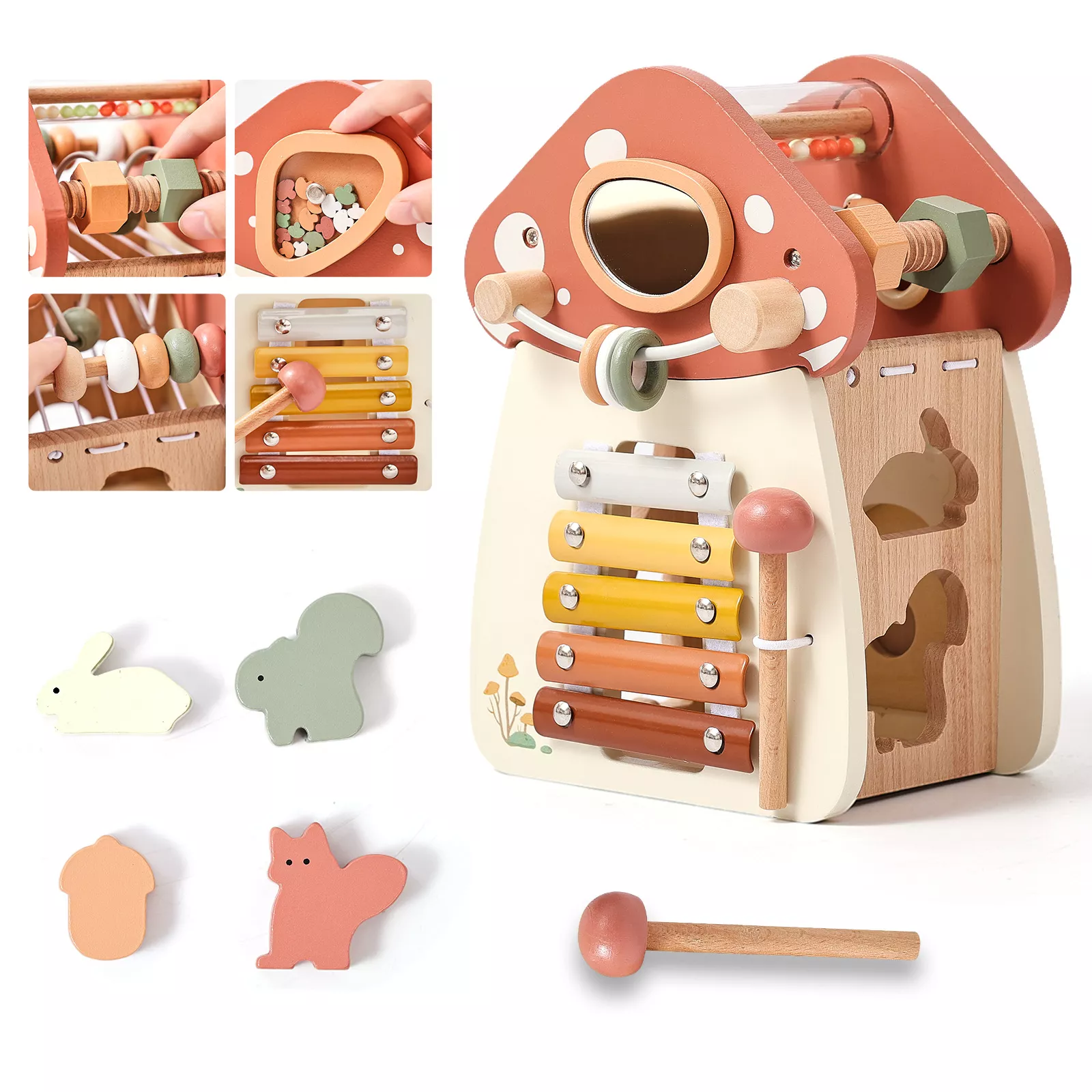 Baby Wooden Montessori Activity Cube with Silicone Geometric Blocks – Five-in-One Multifunctional Toy