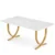 Transform your dining space with this stunning 63″ modern dining table. Featuring a luxurious faux marble tabletop and chic gold geometric metal legs, this table combines elegance and practicality. Its spacious 63″ L x 31.5″ W surface comfortably seats 4-6 people, making it perfect for family dinners, friendly gatherings, or cozy brunches. The sleek design effortlessly complements any interior style, from modern minimalist to contemporary glam.
