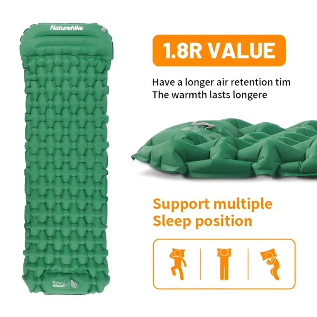 This inflatable mattress is crafted from high-quality 40D nylon with a TPU coating, making it tough, waterproof, and resistant to tears. It measures 78 x 23.2 x 2.6 inches when fully inflated, providing ample space for a good night’s rest. Despite its generous size, it weighs only 1.6 lbs and packs down to a compact 11.8 x 4.3 inches, making it easy to carry in your backpack. The built-in inflator pump allows for quick inflation by simply pressing, so you won’t need to bring a separate pump. With a thickness of about 2.6 inches, it offers excellent cushioning from hard ground while staying lightweight and portable.