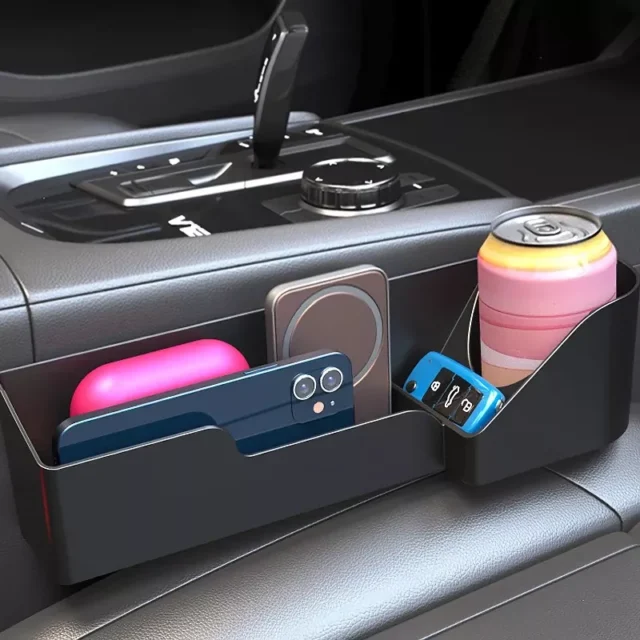 This versatile storage box is perfect for holding drinks, smartphones, wallets, keys, loose change, cards, and other small essentials while driving. No more dropping items between the seats or fumbling around while on the road. It even features a leak-proof water cup holder, keeping your beverage secure and within reach.