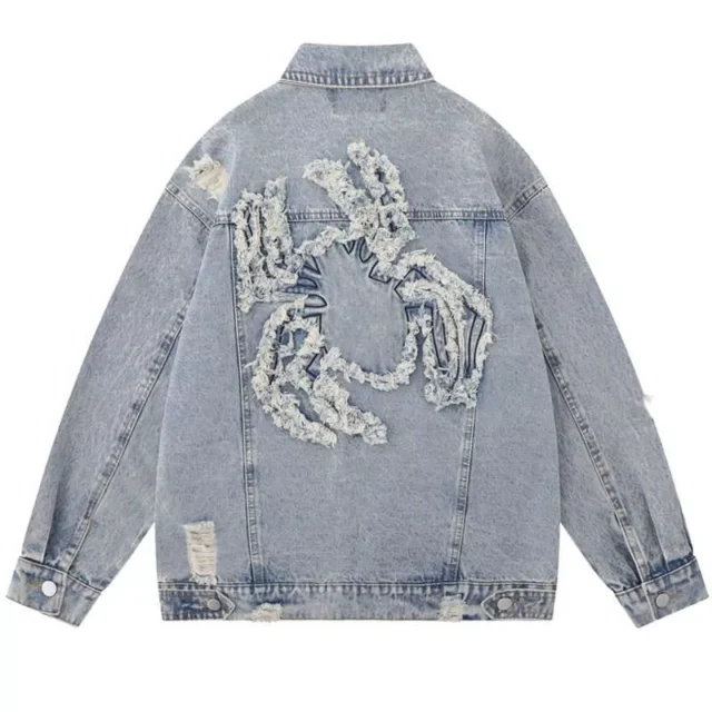 Our jacket is meticulously crafted to deliver both style and comfort. The rugged yet refined look is achieved through a washed and ripped denim texture, bringing an authentic vintage feel to your outfit. The standout feature—a bold spider embroidery—creates a statement that’s hard to miss. The conventional cuff style, standard thickness, and turn-down collar follow the traditional jean jacket blueprint, ensuring a timeless appeal.