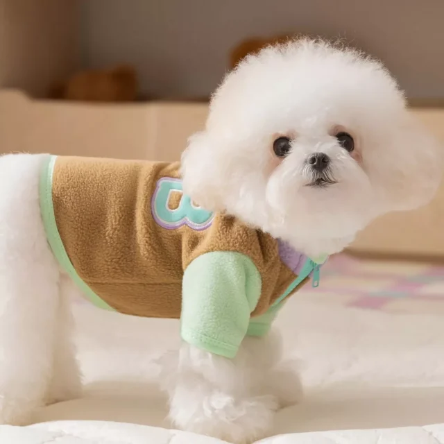 Keep your furry friend warm and stylish all season long with this embroidered fleece sweatshirt designed for small dogs like Teddy breeds and Bichon Frises. Crafted from soft, high-quality polyester fiber, this two-legged jacket is perfect for autumn walks, ensuring your pet feels cozy while looking absolutely charming. The color-block design in white and brown adds a fashionable touch that makes your pup stand out wherever they go.