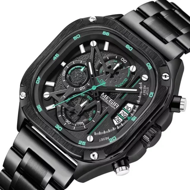 This wristwatch is more than just a timekeeper; it’s a statement of style and efficiency. The multifunctional quartz movement ensures precise timekeeping, while the chronograph function adds a touch of sportiness. The luminous hands make it easy to read the time in low light conditions, and the auto-date feature keeps you on track every day. The square dial gives it a unique, contemporary look that stands out from the crowd.