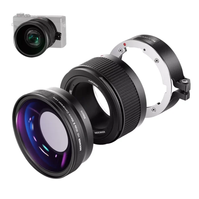 This lens kit combines premium craftsmanship with advanced optical performance. The wide angle lens converts your standard 24mm camera lens into a striking 18mm view, letting you fit more into every frame. For close-up shots, simply remove the wide lens to reveal a 10x macro lens that brings the smallest details into sharp focus. Built with high-definition optical glass and multi-layer nano coating, it delivers vibrant colors, reduces glare, and ensures superior image quality in every shot. The durable aluminum alloy frame ensures a secure and seamless fit, while the extension tube increases magnification without sacrificing clarity.